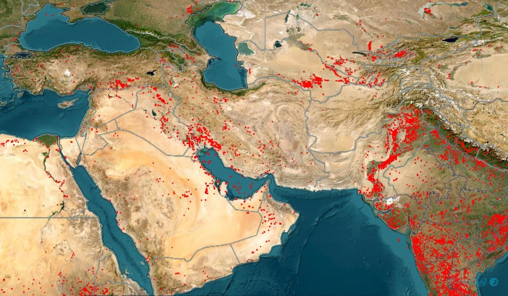NASA FIRMS: از سنسورهای حرارتی برای شناسایی سریع نقاط آتشسوزی، انفجارهای ناشی از برخورد موشک یا فعالیت مشعلهای پالایشگاهی استفاده میکند. firms.modaps.eosdis.nasa.gov