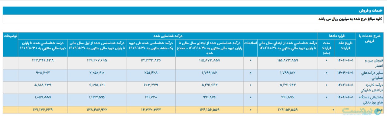 درآمد بخش پشتیبانی از دستگاههای پوز در این بازه زمانی حدود ۱۴ میلیارد تومان ذکر شده است. برای این بخش در ماه گذشته(دی) هیچ درآمدی ثبت نشده بود.
