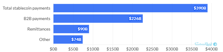 در بخش حوالههای بینالمللی نیز وضعیت مشابهی را برای این فناوری مالی مشاهده میکنیم. پرداختهای استیبلکوینی حدود ۹۰ میلیارد دلار گزارش شدهاند که کمتر از یک درصد بازار حوالههای بینالمللی با ارزش بیش از ۱۰۰ هزار میلیارد دلار است.