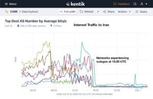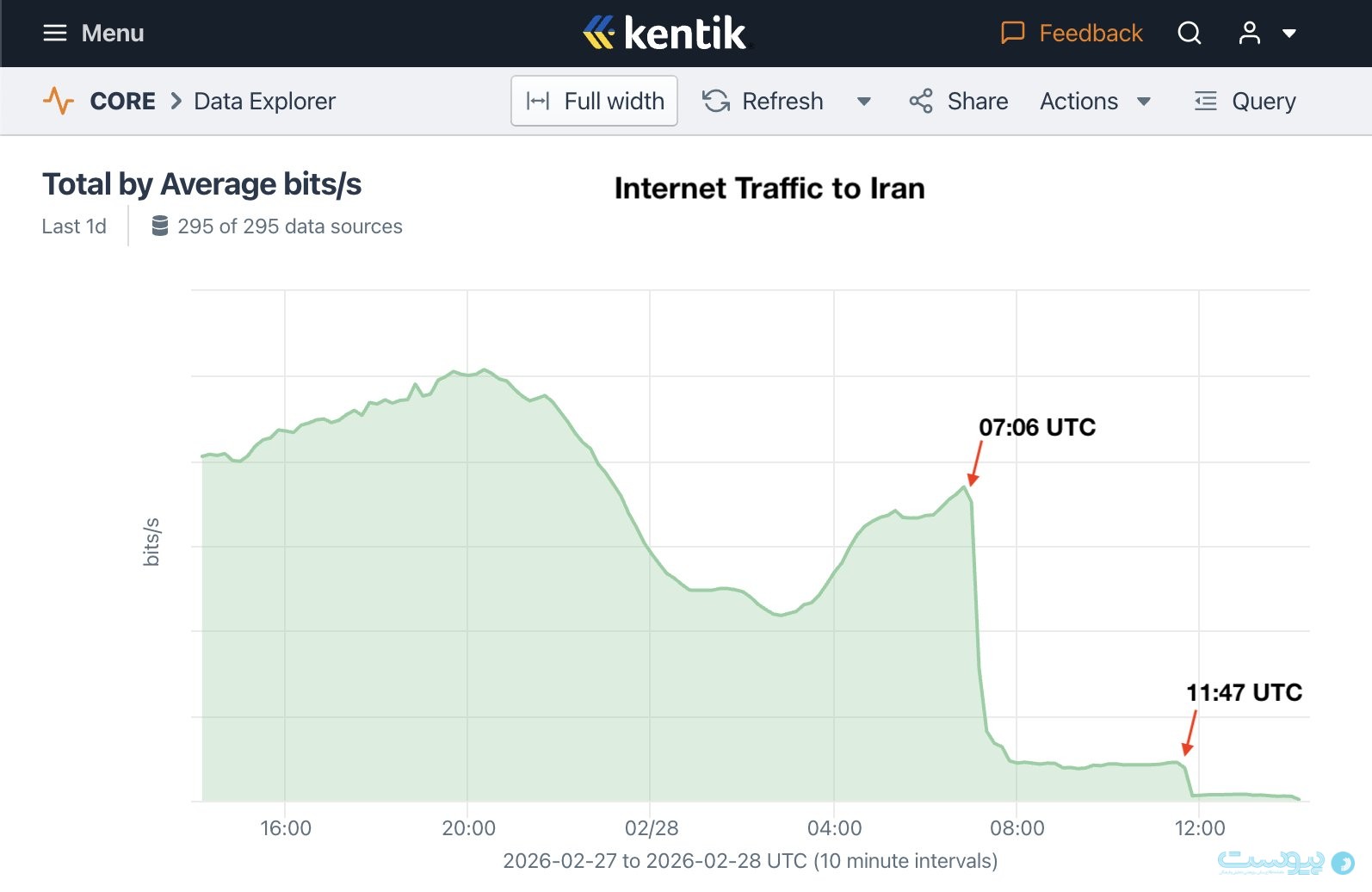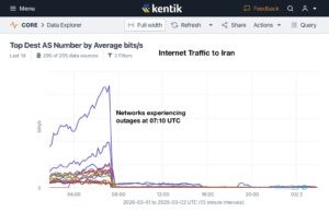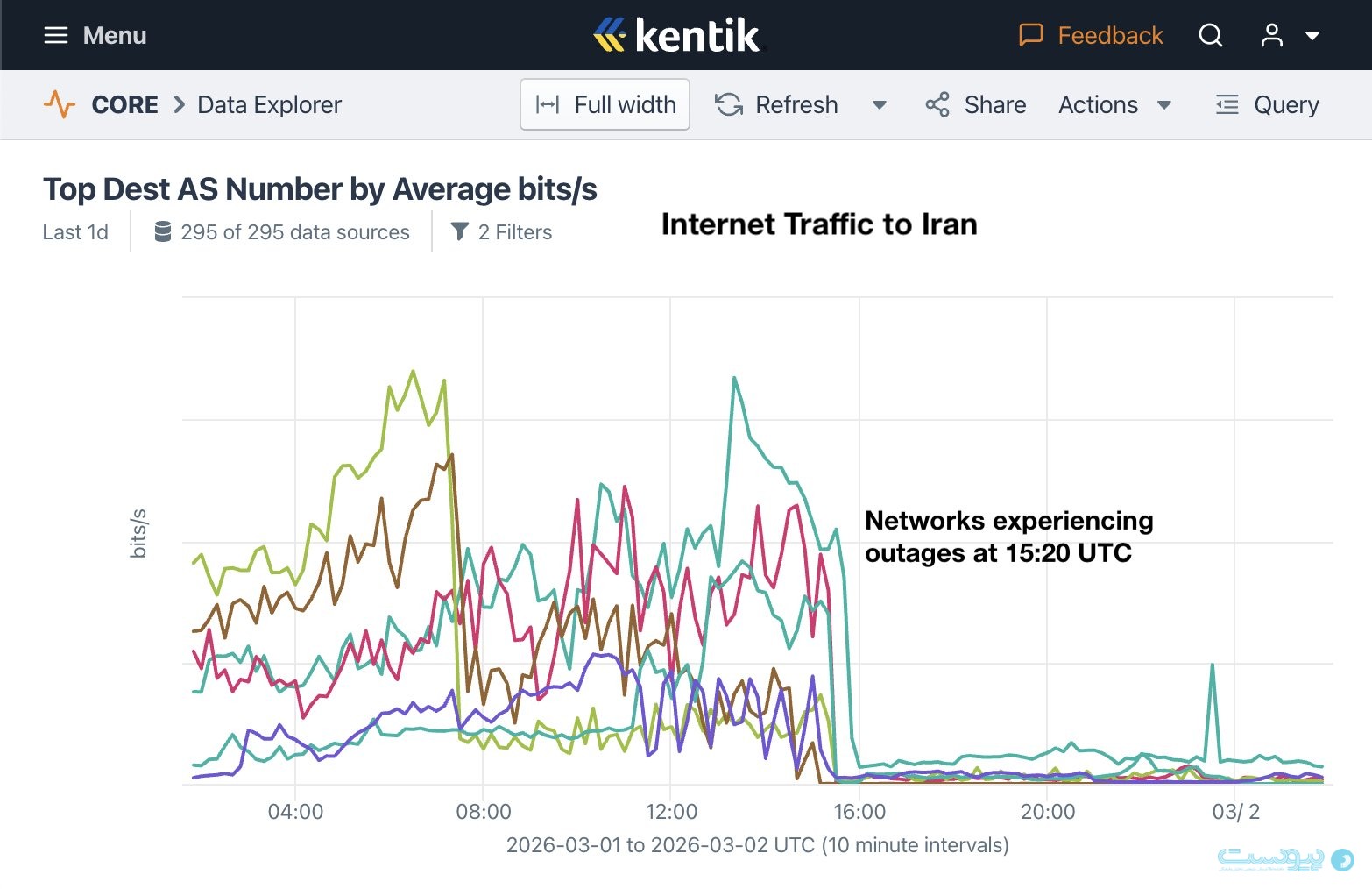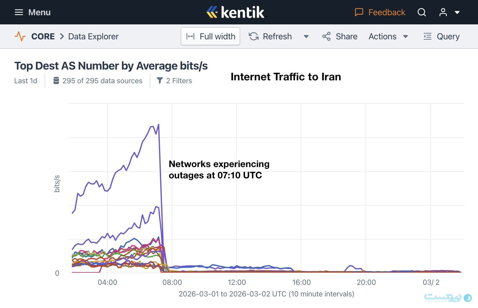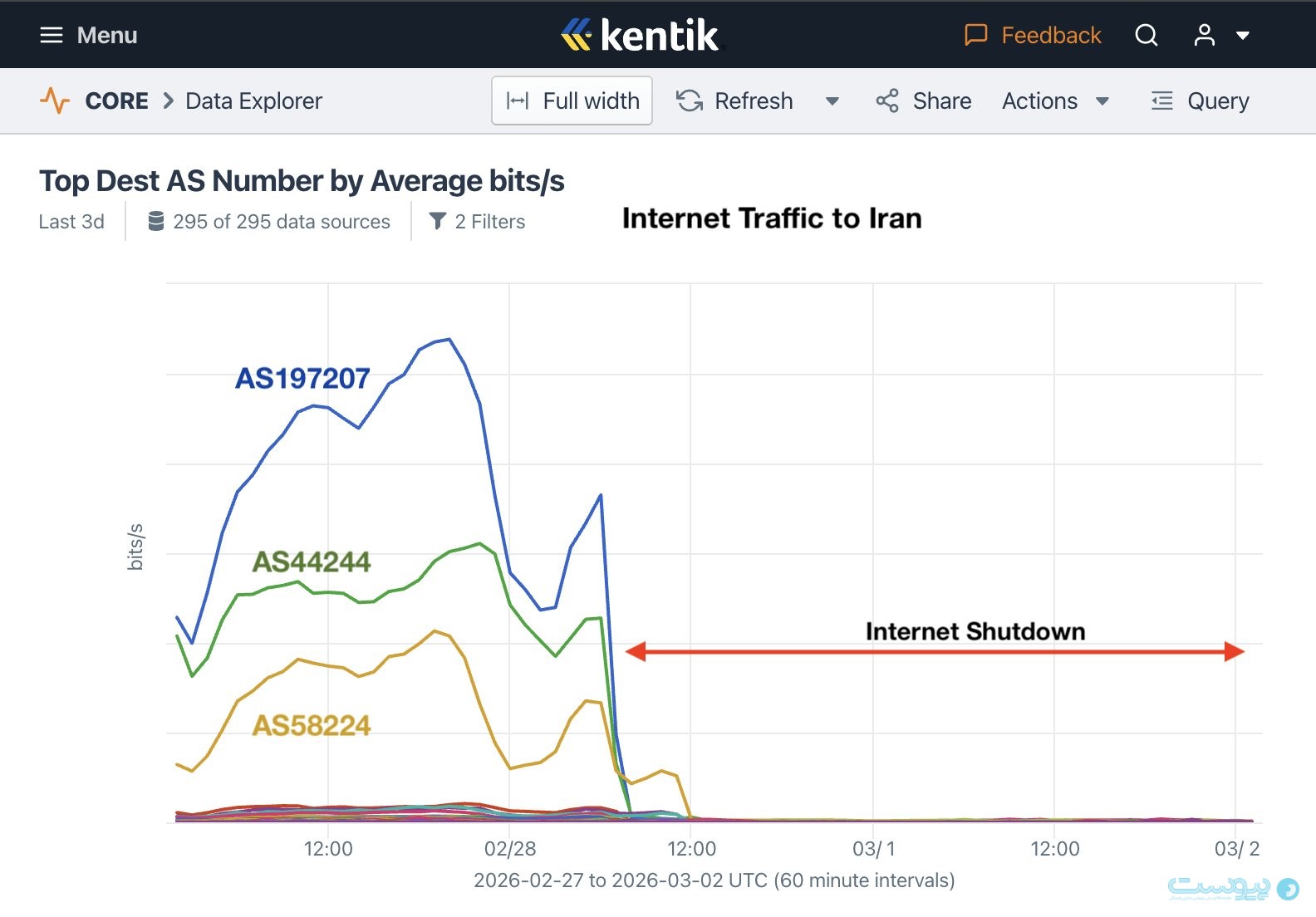 یک کارشناس شبکه بهنام Doug Madory در شبکه ایکس براساس دادههای کنتیک اعلام کرده نمودار ارتباطات نشاندهنده سقوط ناگهانی و یکباره ترافیک در تمامی زیرسیستمهای اصلی (AS Numbers) است. به عنوان مثال سه زیرسیستم کلیدی با حجم ترافیک بالا بهطور همزمان دچار فروپاشی شدهاند. (AS197207، AS44244 و AS58224) این سقوط نامتقارن نشان میدهد قطع شبکه در سطح دروازههای اصلی کشور انجام شده است.