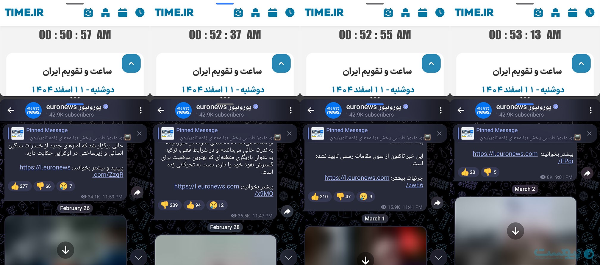 هر پست کانال خبری یورونیوز در تلگرام با حدود ۱۴۰ هزار کاربر بهطور متوسط ۳۵ هزار بازدید دارد اما زمانی که اینترنت در ایران قطع میشود تعداد بازدیدکنندگان هر پست تنها ۲۰ هزار بازدید کاهش پیدا میکند و حدود ۴۰ درصد کاربران همچنان به کانال دسترسی دارند. در اسکرینشات آخر دیده میشود حدود ساعت ۱ بامداد یکی از پستهای این کانال که در ساعت ۲۱ منتشر شده به حدود ۸ هزار بازدید رسیده است. در نتیجه نیمهعمر محتوا در این کانال حدود ۴ ساعت است.