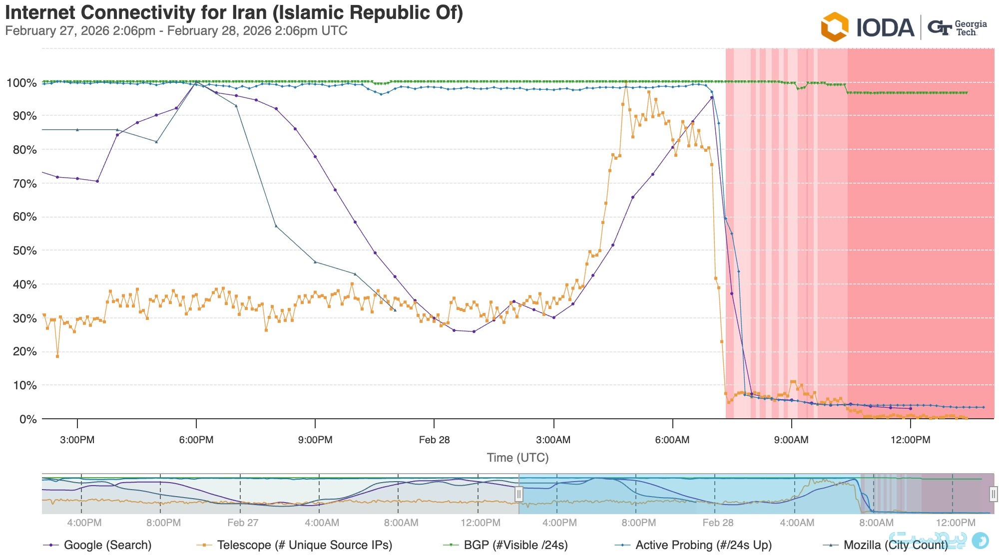بخش اعظمی از زیرساخت اینترنت ایران بیش از ۷۰ ساعت است که در وضعیت قطع کامل قرار دارد. اگرچه مقدار بسیار ناچیزی از ترافیک همچنان در جریان است، اما پایش لحظهای همین ترافیک باقیمانده نشاندهنده وقوع اختلالات ثانویه در فواصل زمانی مشخص است. هنوز معلوم نیست ایران چه زمانی دوباره آنلاین خواهد شد اما رویکرد قطع اینترنت احتمالا دو هدف عمده را دنبال میکند نخست، مسدود کردن جریان اطلاعات و روایتهای غیررسمی و دوم ایجاد یک سپر سایبری برای محدود کردن توان شناسایی و اجرای حملات دیجیتال علیه زیرساختهای حیاتی کشور. بنابراین در خوشبینانهترین حالت تا زمانی که جنگ ادامه دارد اینترنت هم در دسترس نخواهد بود.