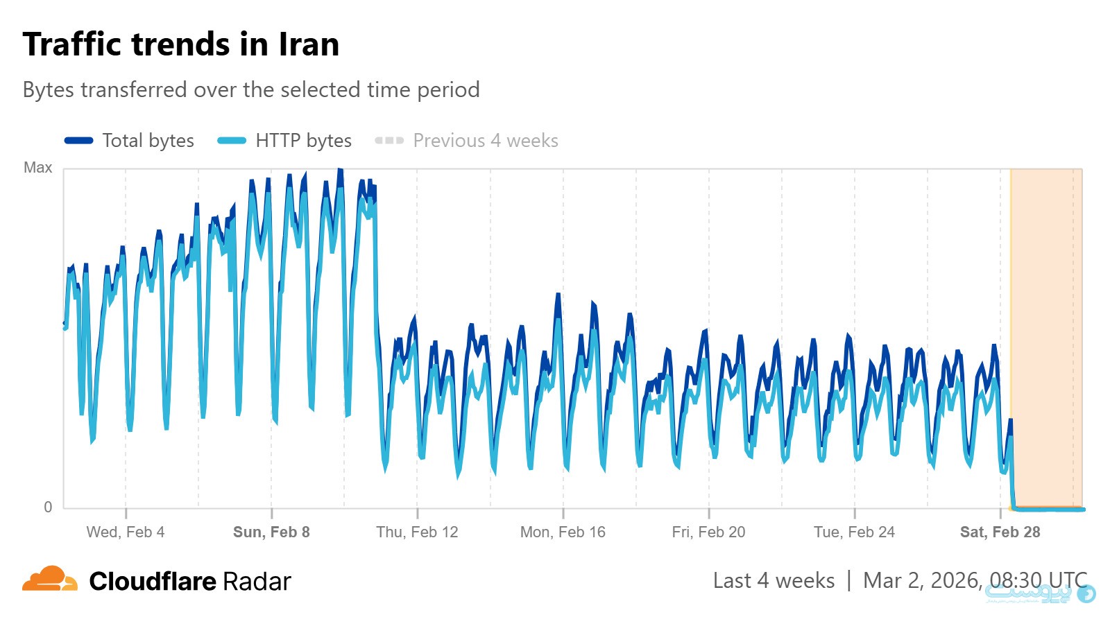 کلاودفلر به عنوان عمومیترین مرجع وضعیت شبکه ایران، نشان میدهد اینترنت کشور که بعد از ۲۲ بهمن با افت قابل توجه ترافیک به کمتر از ۵۰ درصد مواجه شده بود، در روز شنبه نهم اسفند حدود ساعت ۱۰:۳۰ تا ۱۱ صبح بهطور ناگهانی قطع شده و به نزدیک صفر رسیده است.
