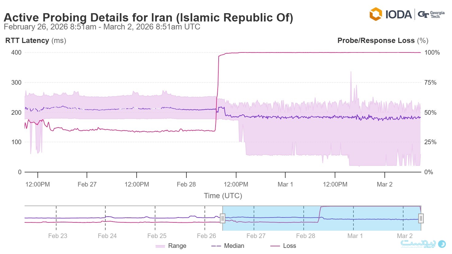 نرخ از دست رفتن پاسخ بلافاصله پس از شروع اختلال به ۱۰۰ درصد رسیده است. این یعنی تقریباً هیچ سیگنالی که برای پایش پایداری به دستگاههای داخل ایران ارسال شده، پاسخی دریافت نکرده است. در معدود پاسخهای دریافتی پیش از قطع کامل، میزان تاخیر نوسانات شدیدی را نشان میداد که از ۲۰۰ میلیثانیه فراتر رفته بود.