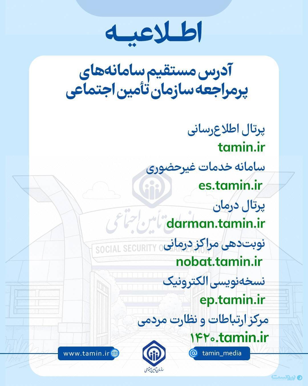 سازمان تامین اجتماعی با توجه به غیرفعال بودن موتورهای جستوجو، آدرس مستقیم سامانههای پرمراجعه این سازمان را اعلام کرد.پرتال اطلاعرسانی tamin.ir سامانه خدمات غیرحضوری es.tamin.ir پرتال درمان darman.tamin.ir نوبتدهی مراکز درمانی nobat.tamin.ir نسخهنویسی الکترونیکی ep.tamin.ir