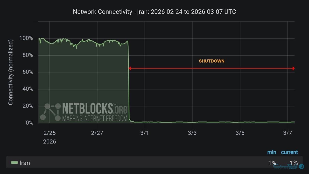 گزارش نتبلاکس نشان میدهد که از قطعی اینترنت در ایران ۱۶۸ ساعت میگذرد و میزان دسترسی به اینترنت فقط یک درصد است.