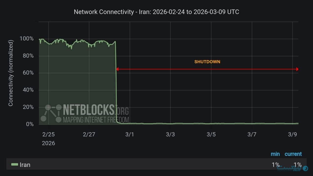 نتبلاکس اعلام کرد ۲۱۶ ساعت از قطعی سراسری اینترنت در ایران میگذرد و همچنان میزان اتصال حدود یک درصد است.