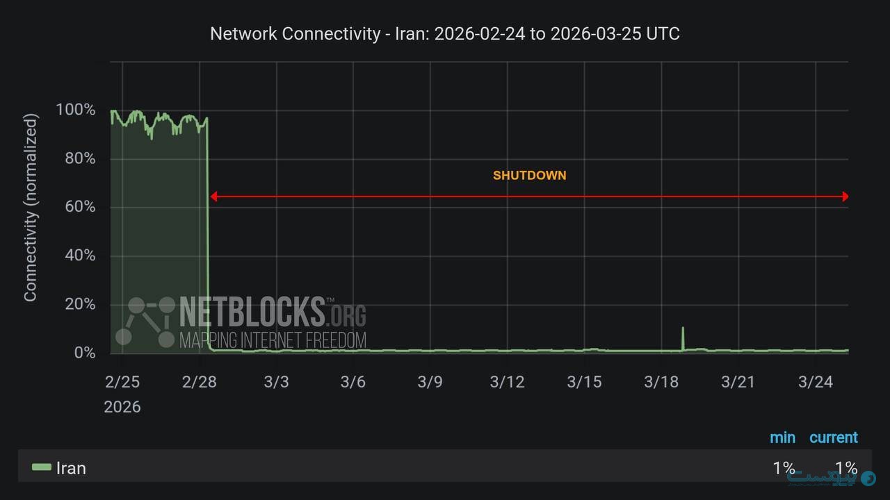 نتبلاکس اعلام کرد قطع سراسری اینترنت در ایران از مرز ۶۰۰ ساعت گذشته و وارد بیستوششمین روز شده است.