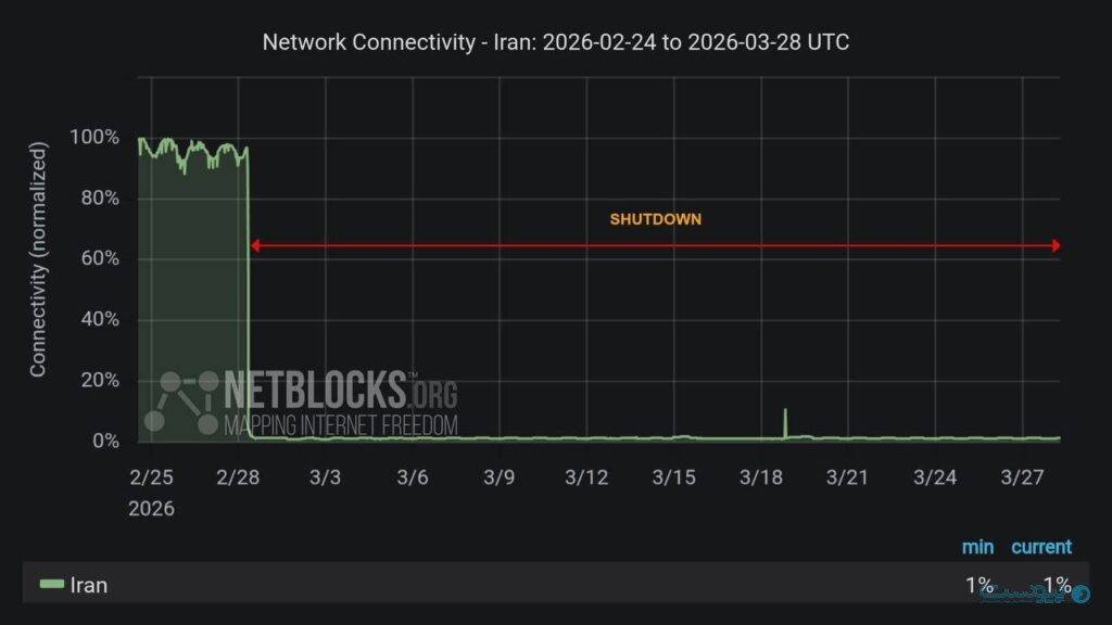 نتبلاکس گزارش داد که امروز شنبه ۸ فروردین درست یک ماه است که قطع اینترنت در ایران گذشته است و میزان قطعی اینترنت بین الملل به ۶۷۲ ساعت میرسد.