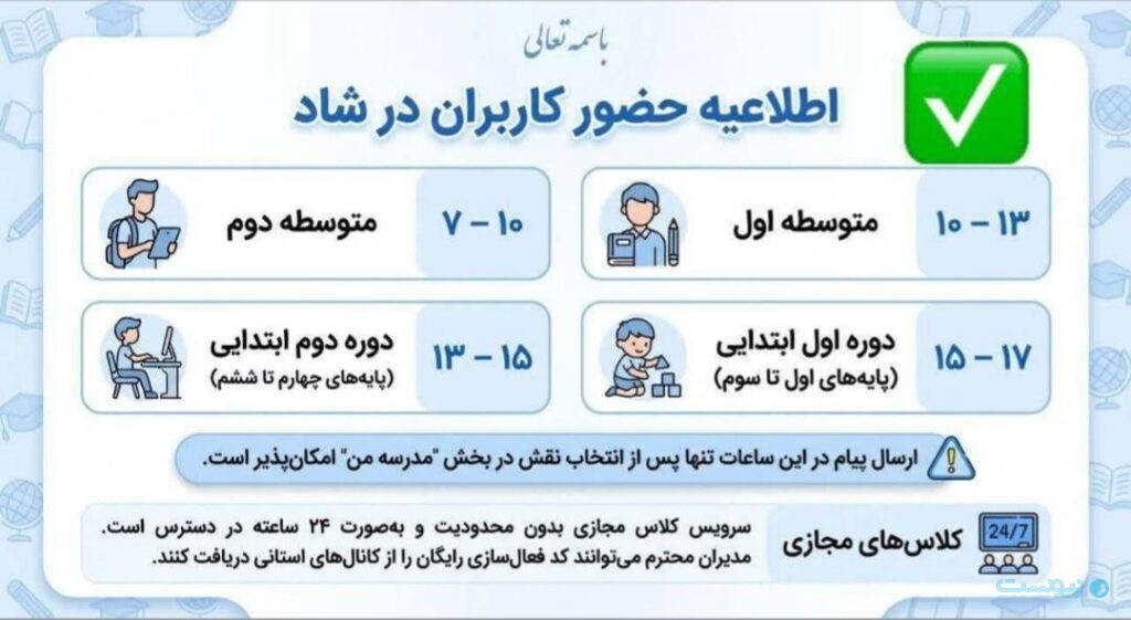 طبق این اطلاعیه کلاسهای متوسطه اول و دوم در نیمه صبح و دوره ابتدایی در نیمه بعد از ظهر کلاسهایشان برگزار میشود.