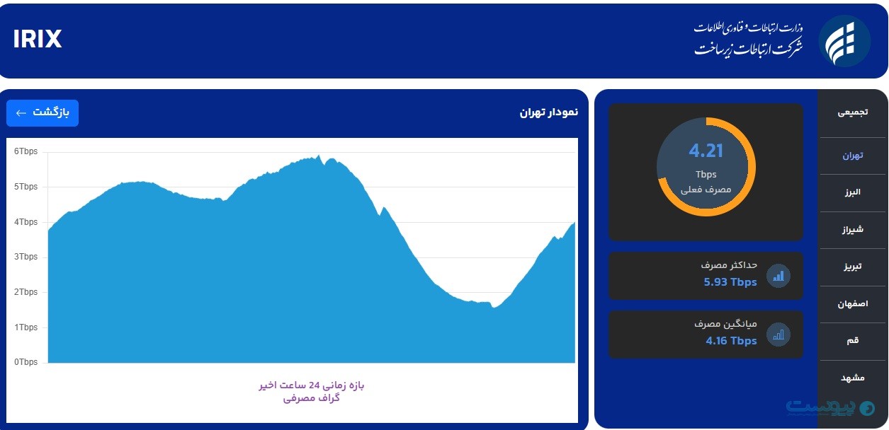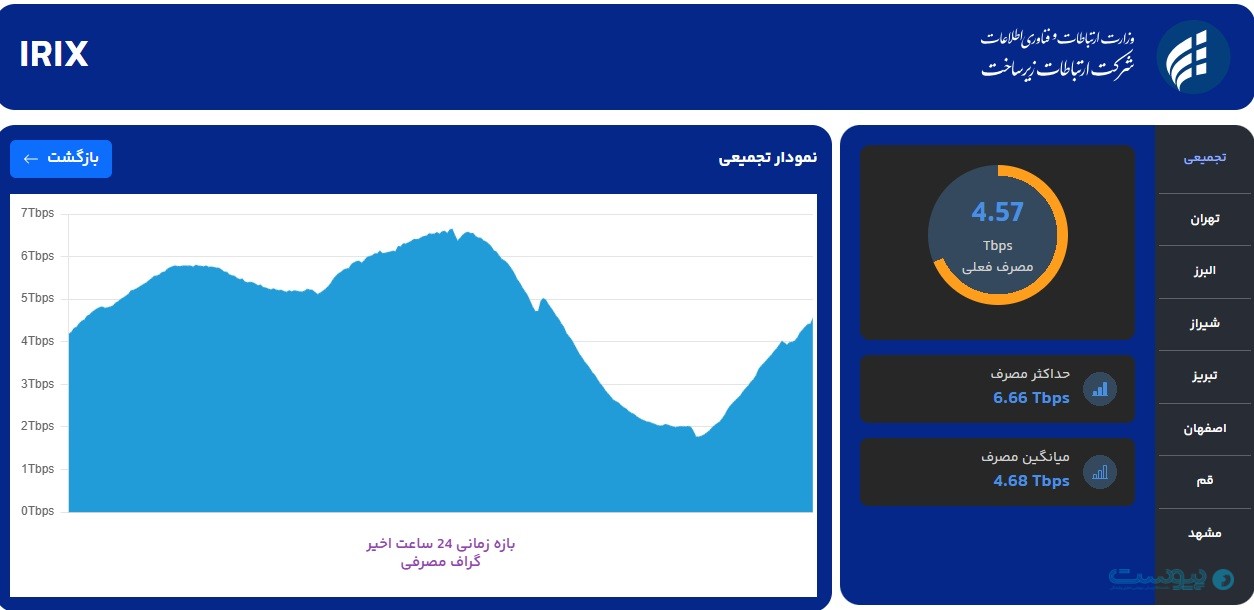 در حالی که حداکثر مصرف دیتا در ۲۴ ساعت منتهی به ظهر روز ۱۵ فروردین به صورت تجمیعی ۶.۶۶ ترابیت بر ثانیه است، ترافیک در تهران به ۵.۹۳ ترابیت بر ثانیه رسیده است. این نشان میدهد سهم تهران از کل ترافیک به ۸۹ درصد رسیده است. این سهم در روزهای تعطیلات نوروز حدود ۷۰ درصد بود.