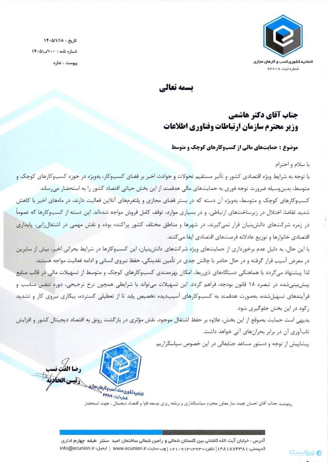 به گزارش پیوست، در بخش ابتدایی این نامه آمده است: کسبوکارهای کوچک و متوسط، بهویژه آن دسته که در بستر فضای مجازی و پلتفرمهای آنلاین فعالیت دارند، در ماههای اخیر با کاهش شدید تقاضا، اختلال در زیرساختهای ارتباطی و در بسیاری موارد توقف کامل فروش مواجه شدهاند. این دسته از کسبوکارها که عموما در زمره شرکتهای دانشبنیان قرار نمیگیرند، در شهرها و مناطق مختلف کشور پراکنده بوده و نقش مهمی در اشتغالزایی، پایداری و اقتصادی خانوارها و توزیع عادلانه فرصتهای اقتصادی ایفا میکنند. توجه فوری به حمایتهای مالی هدفمند از این بخش حیاتی اقتصاد کشور ضروری است.