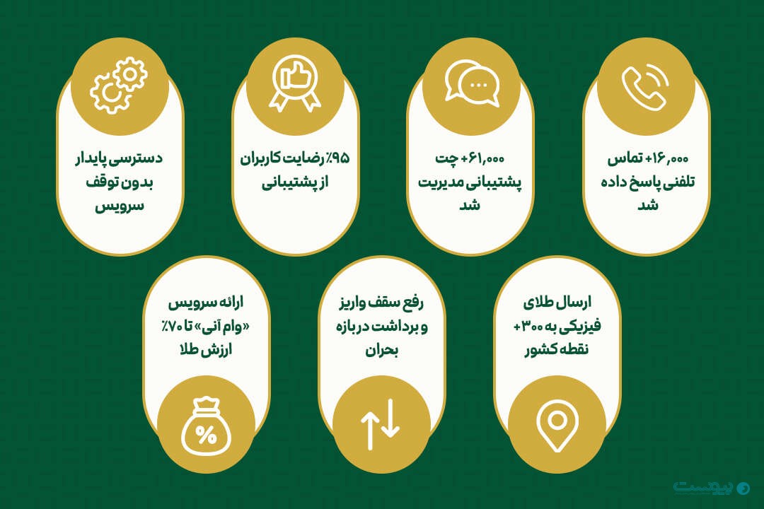 پشتیبانی ملّیگلد در بازه جنگ به بیشتر از ۱۶ هزار تماس تلفنی و بیش از ۶۱ هزار چت کاربران پاسخ داده و امکان ارسال طلای فیزیکی به بیش از ۳۰۰ نقطه مختلف در سراسر ایران را فراهم کرده است.