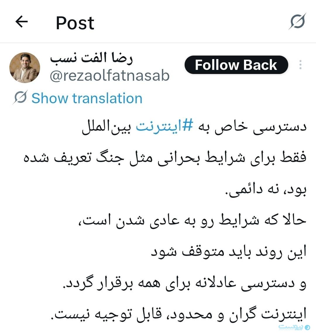 رضا الفتنسب در توییتی تاکید کرده است دسترسی خاص به اینترنت بینالملل فقط برای شرایط بحرانی مثل جنگ تعریف شده بود نه دائمی و از مسئولان خواسته حالا که شرایط رو به عادی شدن است دسترسی عادلانه برای همه برقرار شود. او اینترنت گران و محدود را غیر قابل توجیه خوانده و خواسته تا این روند متوقف شود.