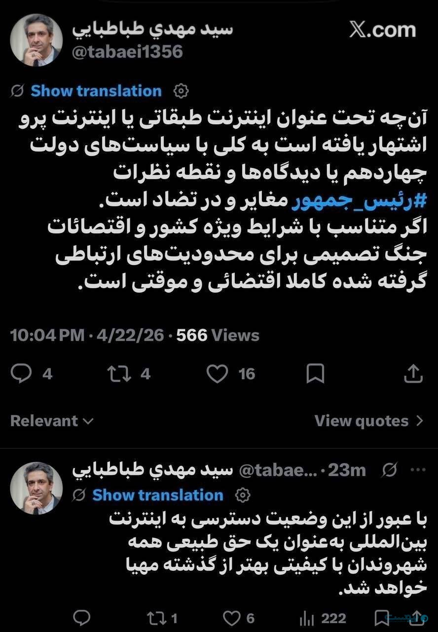 معاون ارتباطات و اطلاع رسانی دفتر رئیس جمهور، سید مهدی طباطبایی در شبکه اجتماعی ایکس خود نوشت: آنچه تحت عنوان اینترنت طبقاتی یا اینترنت پرو اشتهار یافته است به کلی با سیاستهای دولت چهاردهم یا دیدگاهها و نقطه نظرات رئیس جمهور مغایر و در تضاد است. اگر متناسب با شرایط ویژه کشور و اقتضائات جنگ تصمیمی برای محدودیتهای ارتباطی گرفته شده کاملا اقتضائی و موقتی است. با عبور از این وضعیت دسترسی بینالمللی به عنوان یک حق طبیعی همه شهروندان با کیفیتی بهتر از گذشته مهیا خواهد شد.
