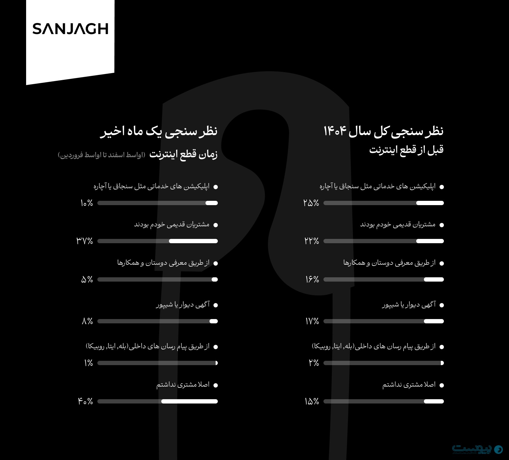 سنجاق در سال ۱۴۰۴ هم نظرسنجی دیگری از متخصصان خود انجام داده و از آنها خواسته بود که اعلام کنند از چه کانالهایی مشتریان خود را جذب میکنند؟ براساس این نظرسنجی در زمان دسترسی به اینترنت بیشترین مشتری را از طریق اپلیکیشن هایی چون سنجاق و آچاره دریافت می کردند. امکانی که در زمان جنگ و قطع اینترنت از آنها گرفته شده است. نکته قابل توجه دیگر در این نظرسنجی سهم بسیار اندک پیامرسانهای داخلی در زمینه جذب مشتری است. چه در زمان دسترسی به اینترنت بینالملل و چه در زمان قطع آن، کمترین میزان مشتری (یک درصد) توسط کانالهای داخلی مانند ایتا و بله و روبیکا جذب شده است که این مساله نشان میدهد سرمایهگذاری استارتاپها روی این اپلیکیشنها تاثیری بر ارتباط مشتریان با متخصصان ندارد و مردم ترجیح میدهند خدمات خود را از طریق اپلیکشنهای تخصصی دریافت کنند.